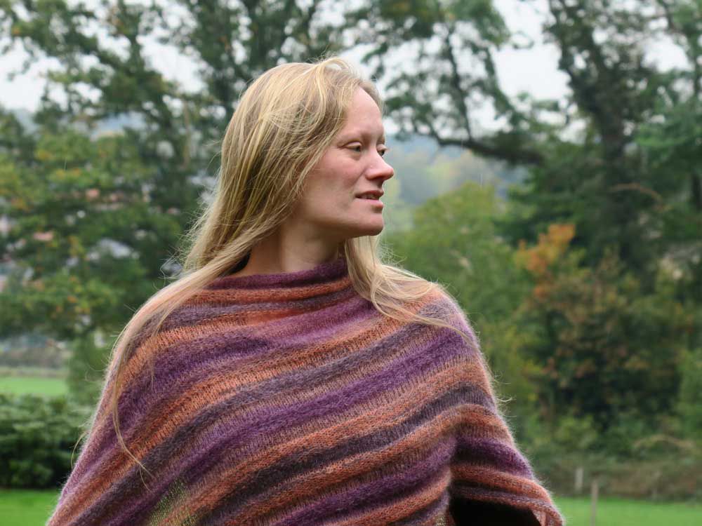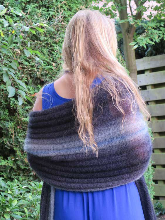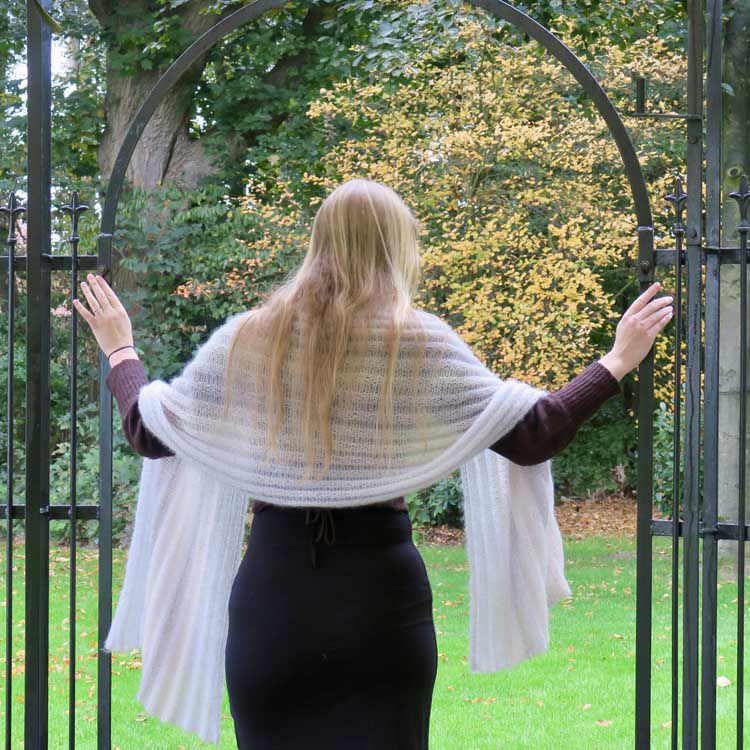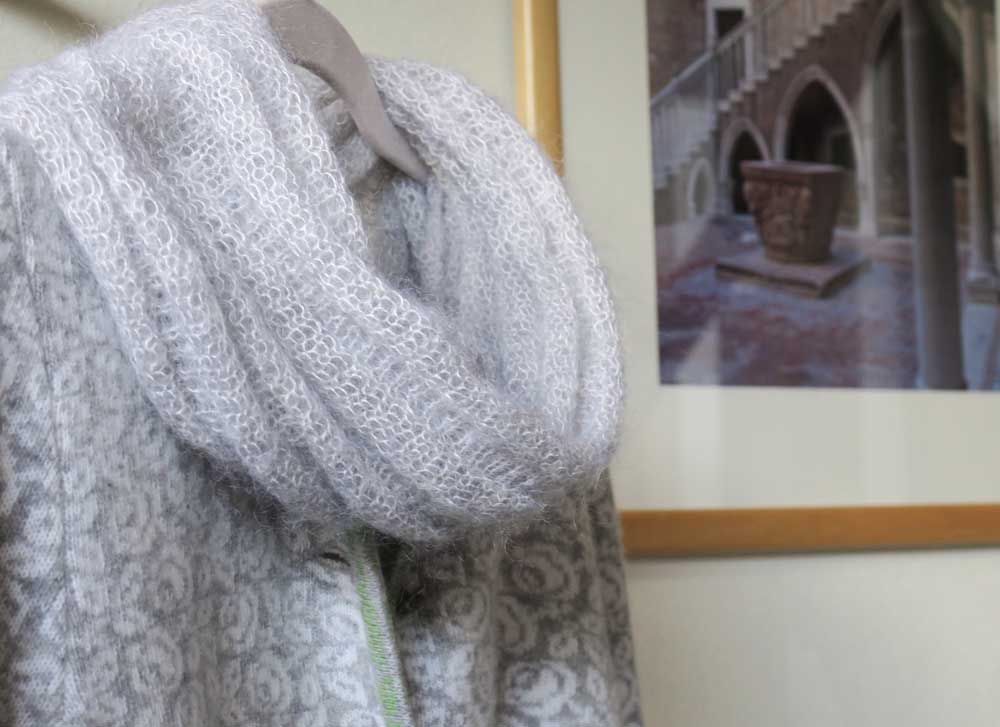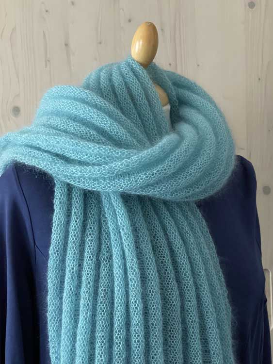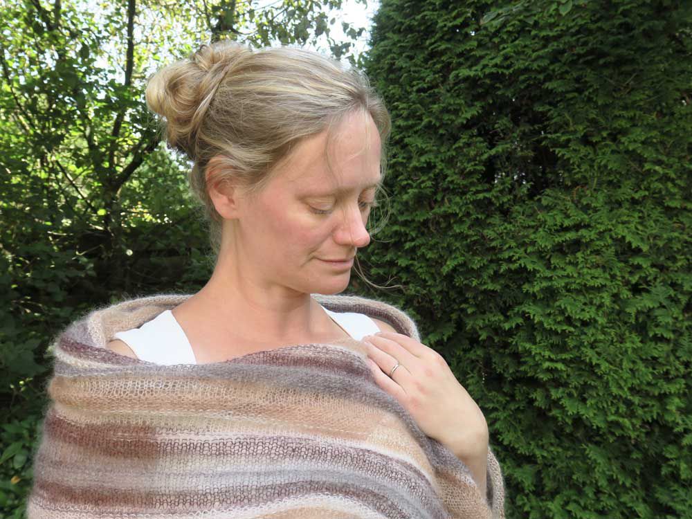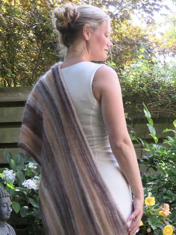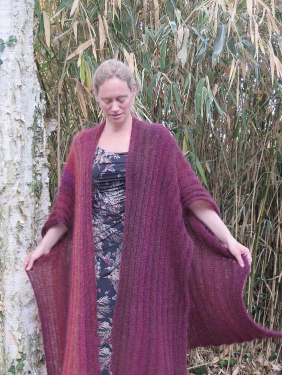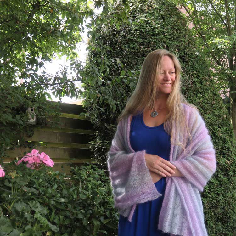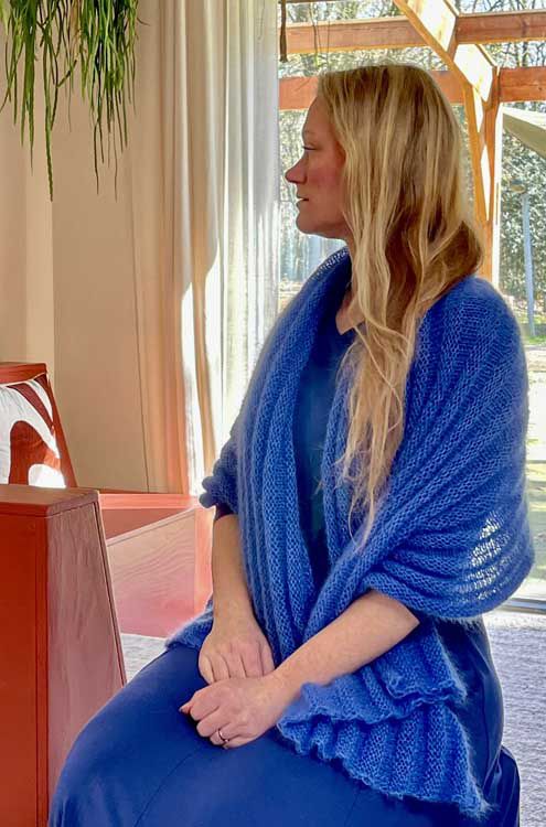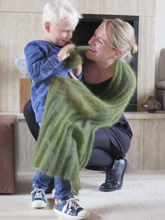 Het tactiele van het breien met dit ragfijne garen van mohair/zijde brengt mij rust. De eigenschap van het materiaal is vederlicht en warm. Dit is voelbaar in het dragen.